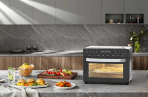 Our air fryer ovens use high-speed air circulation to distribute heat. A powerful fan and heating element create a hot air vortex, cooking food evenly and quickly. According to Energy Star, air fryer ovens use 1–1.5 kWh per use, making them efficient for small to medium meals. Our 16L model, for example, can roast a chicken in 25–30 minutes.